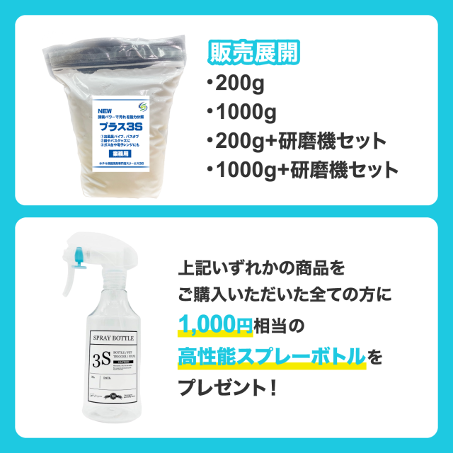 お風呂の汚れ徹底洗浄 お風呂 浴室 洗面所 排水管 パイプ掃除 排水溝 詰まり カビ 洗浄 洗剤 プラス3S (200g+高性能スプレーボトル付属) 掃除 ぬめり取り 排水クリーナー 排水パイプ シンク 洗面台 大掃除 (業務用)
