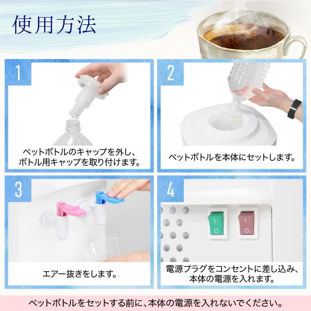 温冷水 温冷両用 水分補給 ペットボトル ペットボトル式 コンパクト チャイルドロック 軽い 簡単 小型 保証付き リビング キッチン 台所 寝室 子供部屋 オフィス 会社 工事現場 病院 待合室 イベント アウトドア キャンプ 一人暮らし 介護 施設 コーヒー 紅茶 お茶 白湯 水割り サワー ミルク スポーツドリンク ジュース