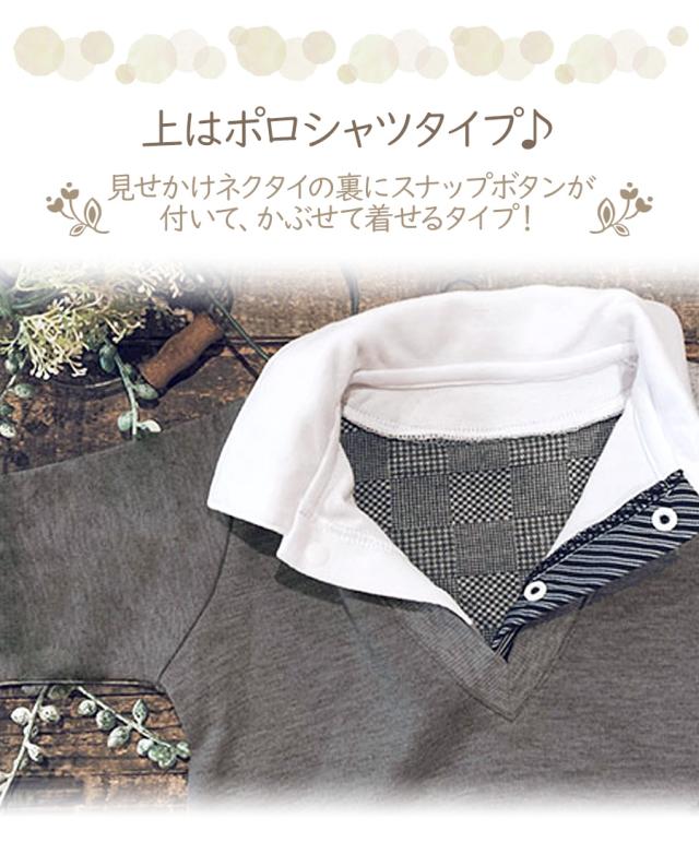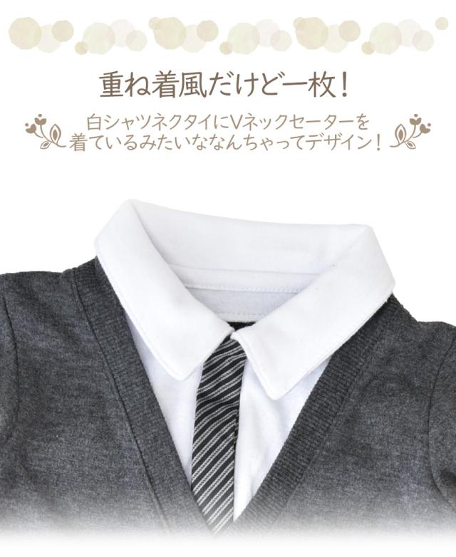 ネクタイをした白いシャツにVネックセーターを重ね着したみたいな、これ一枚でコーデが完成しちゃってる、便利なフォーマルカバーオール。