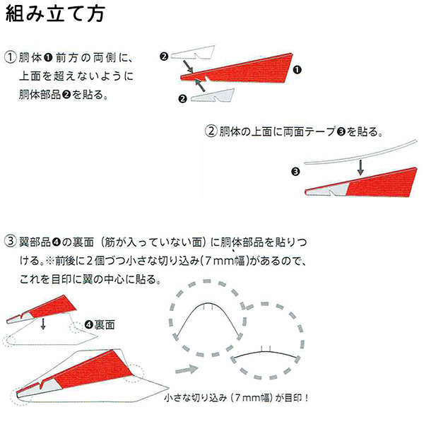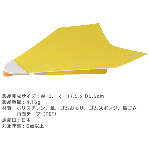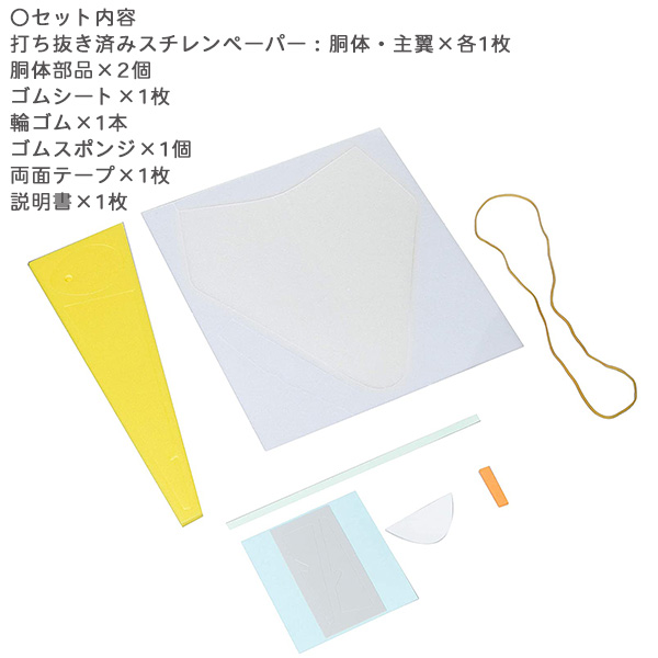 セット内容:打ち抜き済みスチレンペーパー(胴体×1、主翼×1)、胴体部品×2、ゴムシート×1、輪ゴム×1、ゴムスポンジ×1、両面テープ×1、説明書×1