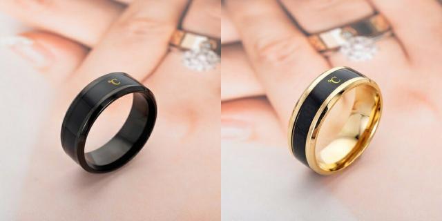 指輪に気温や体温など温度で色が変わり数字が出る温度計をセットした面白いステンレスリングです