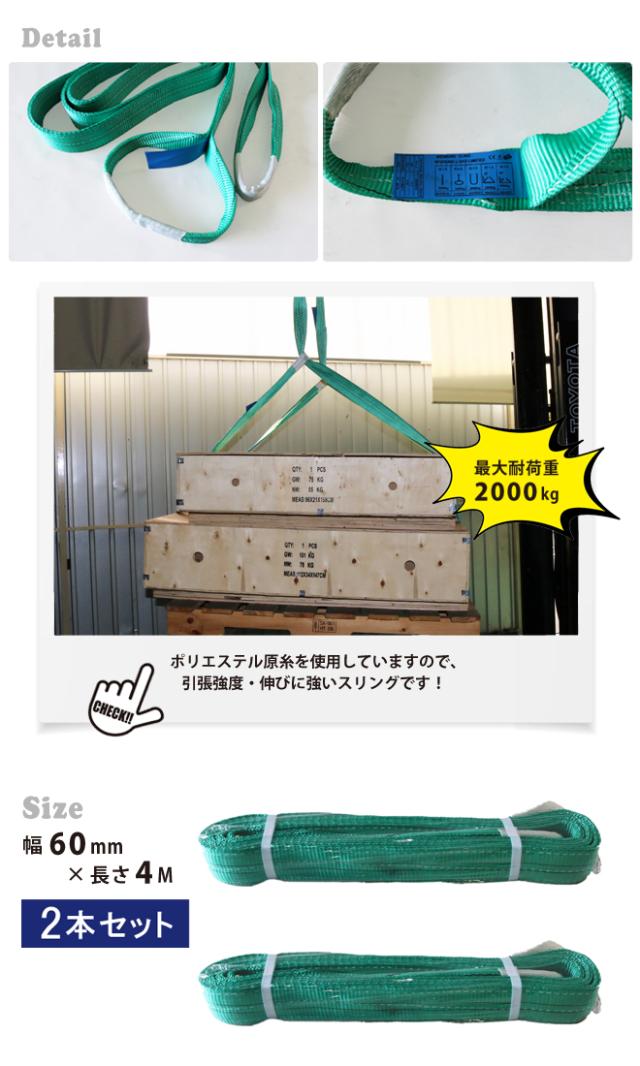 耐光性・耐水性に優れているスリングベルト! ●ポリエステル原糸を使用していますので、引張強度・伸びに強いスリングです ●折り曲げてもクセがつき難くいです ●銅・アルミ・プラスチック・木製品等のワイヤースリングでの傷を嫌う商品の 玉掛作業には最適です ●耐光性・耐水性に優れていますので屋外でも使用できます ●ベルト幅60mmのワイド設計です ●幅が広いので吊り上げ時に傷をつけず、商品に優しいスリングです ●工業製品国際規格CEマーク取得の一級品です 【 ご注意 】 ※角張った吊荷はそのままでは吊れません 横滑りや突起による引っ掛けには大変弱いため、角のある吊荷やでっぱりがある吊荷には 必ず補強パッドなどの角あてを使用して下さい ※高温にも弱いので必ず100℃以下の環境で使用して下さい/合わせて酸類にも非常に弱いので 酸洗い等には絶対に使用しないで下さい ※使用荷重はストレートで吊った場合の値なのでご注意ください 品番:SET-PS-2-4 |