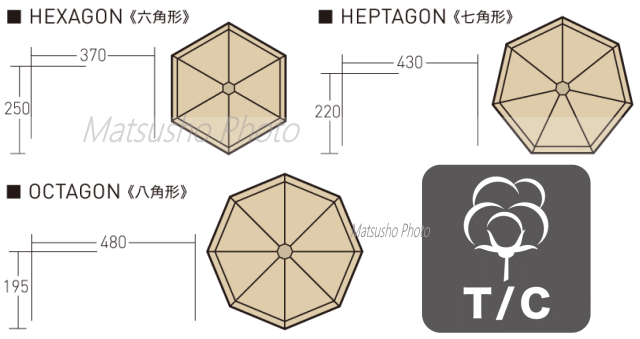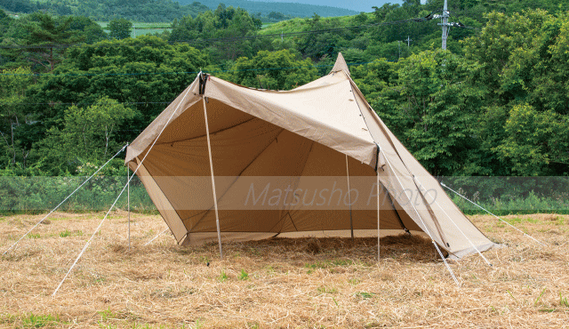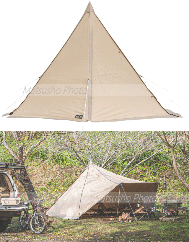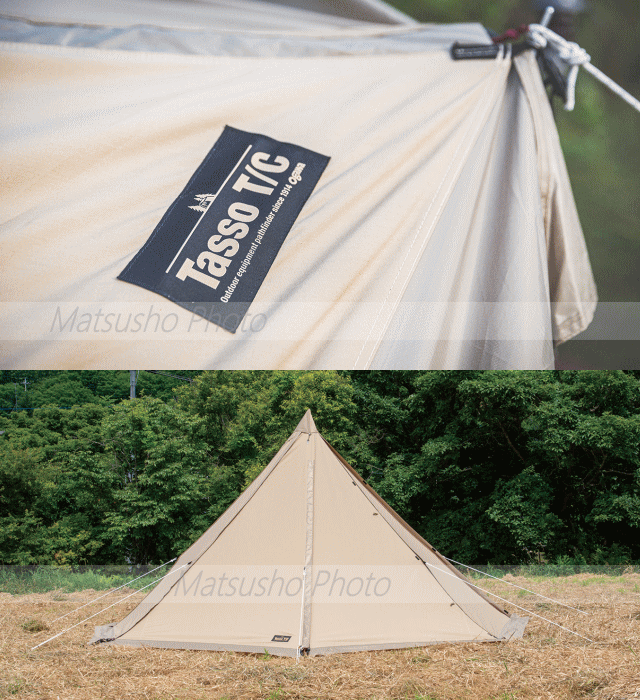 タッソにT/Cバージョンが誕生。使うひとの数だけ新しい表情が生まれるタッソ。張り方のバリエーションが多彩でベテランからビギナーまで人気。前後トリプルファスナーなどの機能はそのままに快適さをプラス。ソロ、デュオにちょうどいいサイズ感です。■重量:総重量(付属品除く)7.4kg、付属品重量約3.1kg、[内容]フライ約6.3kg、ポール約1.0kg■素材[フライ]T/C(耐水圧350mm)[ポール]6061アルミ合金 φ30mm■収納サイズ74×24×24cm■カラー:サンドベージュ■付属品:ガイドシート、ガイドロープ、張り綱、アイアンハンマー、スチールピン、収納袋【大型商品のため同梱発送不可】※張り出しポールは別売です。六角形状時、ツインピルツフォークLのハーフインナーが利用可能です。本商品はフライにT/Cを使用しており縫い目にシームシール加工をしていない為、雨が侵入する場合があります。