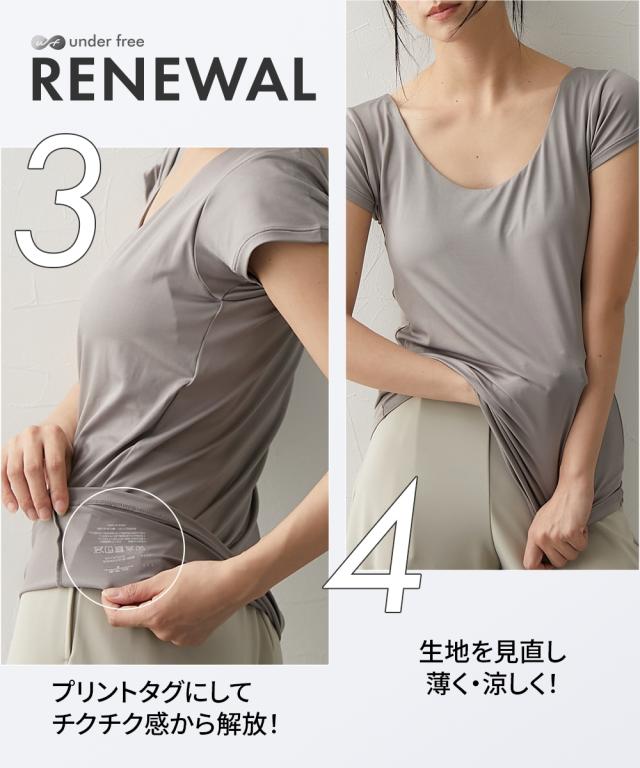 「締め付けゼロ」はそのままに。 もっと涼しく、もっと美しく。 さらに進化した、新・アンダーフリー体験へ。 締め付けない、ストレスフリーな着心地はそのまま、スッキリとした見た目と着用時のバストラインの美しさをさらに追求しました。 【涼感アップ】 身生地をより薄く、カップ裏をメッシュ構造に。熱がこもらず、さらりと快適。 【見た目スッキリ】 パイピングをなくし、フラットな「見返し仕様」へ。服に響かず、洗練された印象に。 【理想のバストライン】 カップのパターンを一新。ノンワイヤーでも、自然で美しいバストラインをキープします。 【肌ストレスフリー】 チクチクするタグをなくし、プリント仕様に。肌への刺激を極限まで減らしました。楽なだけじゃなく、バストラインも美しく整える、さらに進化したアンダーフリー、ぜひ体験してください。 締め付けない キレイ魅えのブラトップ 【アンダーフリー】 ニッセンだけの特別なブラトップです。人気の秘訣は、カップ部分の生地全体でバストを支える構造にあります。ブラトップの標準的な仕様であるアンダー部分のゴムを取り除き、伸縮性の高い生地にすることで、面でバストを支えます。ホールド感や安定感を維持しながら、