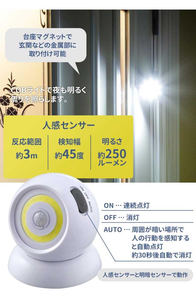 人感センサーライト 屋外 防犯ライト COBセンサーライト マグネット台座付 防犯 夜間照明 玄関 廊下 階段 防災 地震 停電 緊急時 小型ライト 懐中電灯 フットライト 間接照明 壁掛け セーブインダストリー
