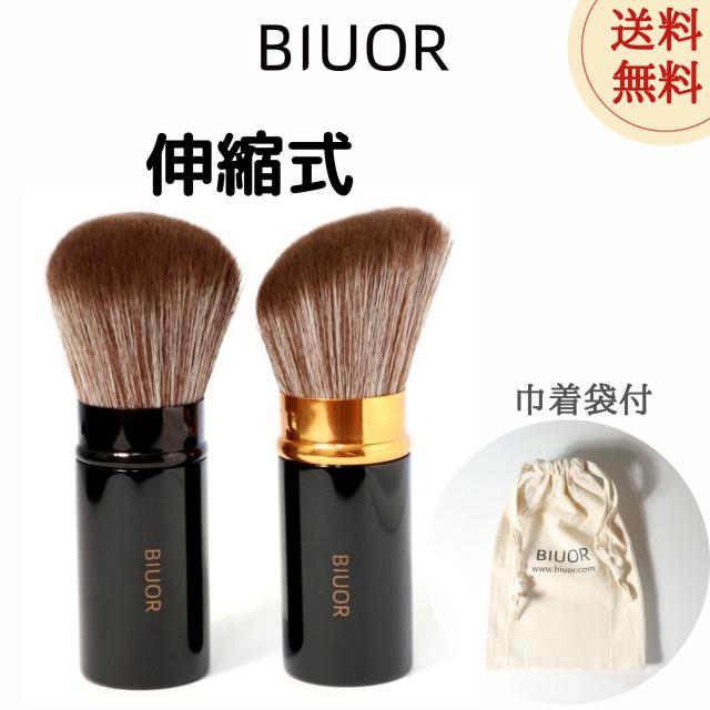 【送料無料】 BIUOR 伸縮式2点セット メイクブラシ フェイスブラシ パウダー/チークブラシ カブキブラシ 携帯用 超柔らかい ブラック プレゼント 巾着 袋付