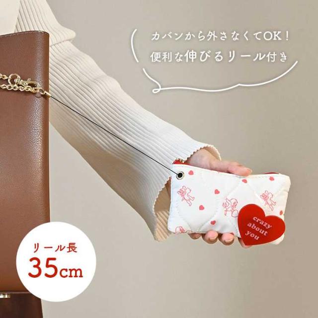 ハートでいっぱいのデザインが可愛いカードポーチが新登場!取り外し可能なハート型バッジがポイント。ドキッとときめくキャラクターのイラストに、小さなハートが散りばめられた柄が可愛い♪カードを入れられるだけでなく、キーケースとしても使えます。内側についたキーリング付きのリールが伸びるので、バッグにケースを付けたまま鍵の開閉が可能です。大切な人へのギフトにもおススメ。