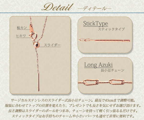 | コメント | スライダー式のステンレスチェーンはご自身でサイズ調整ができとても便利です。 0.8mmの長あずきチェーンは繊細で女性らしい首元に。 今まで金属アレルギーでアクセサリーが着けれなかった方にオススメ!! 医療用に使われているサージカルステンレスは肌に優しく、金属アレルギーでアクセサリーをつけられない方にも安心です。シルバーアクセサリーより軽くて丈夫で変色しにくい素材ですのでお手入れ不要で海水や温泉につけても大丈夫です。 |