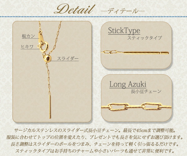 | コメント | スライダー式のステンレスチェーンはご自身でサイズ調整ができとても便利です。 0.8mmの長あずきチェーンは繊細で女性らしい首元に。 今まで金属アレルギーでアクセサリーが着けれなかった方にオススメ!! 医療用に使われているサージカルステンレスは肌に優しく、金属アレルギーでアクセサリーをつけられない方にも安心です。シルバーアクセサリーより軽くて丈夫で変色しにくい素材ですのでお手入れ不要で海水や温泉につけても大丈夫です。 |