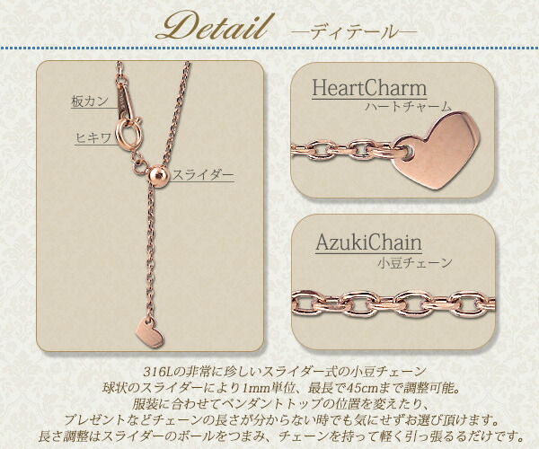 | 商品名 | スライダー式カットあずきチェーン ローズゴールド ハートチャーム ステンレスチェーン サージカルステンレス アクセサリー |