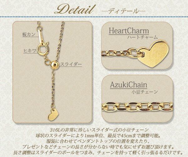 ステンレス ネックレスチェーン ネックレス チェーン スライド カットあずきチェーン スライダー サージカルステンレス ハート イエローゴールド 45cm アズキ 小豆 レディース メンズ 金属アレルギー 対応 アジャスターチェーン ギフト 誕生日 記念日