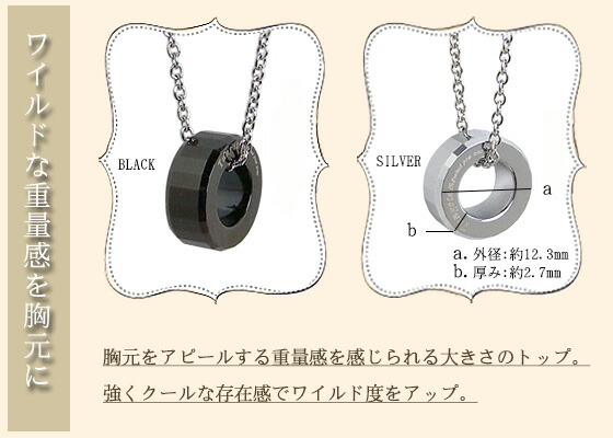 | コメント | タングステン使用のリングアクセサリー。 サージカルステンレス製あずきチェーン付き。長さ40cm,45cm,50cm選択可。 タングステンとはレアメタルの一つでダイヤモンドに匹敵する硬度をもち独特の黒い輝きがあります。 |