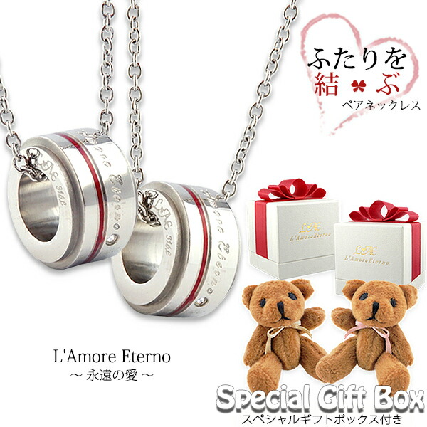 ペアネックレス 2本セット ステンレス 刻印無料 リング型 ふたりを結ぶ糸 縁結び 恋愛 サージカルステンレス ペア ネックレス 金属アレルギー対応 ジルコニア 記念日 ベアー付き シルバー ローズゴールド ペア ペンダント クマ メンズ レディース 大人 シンプル