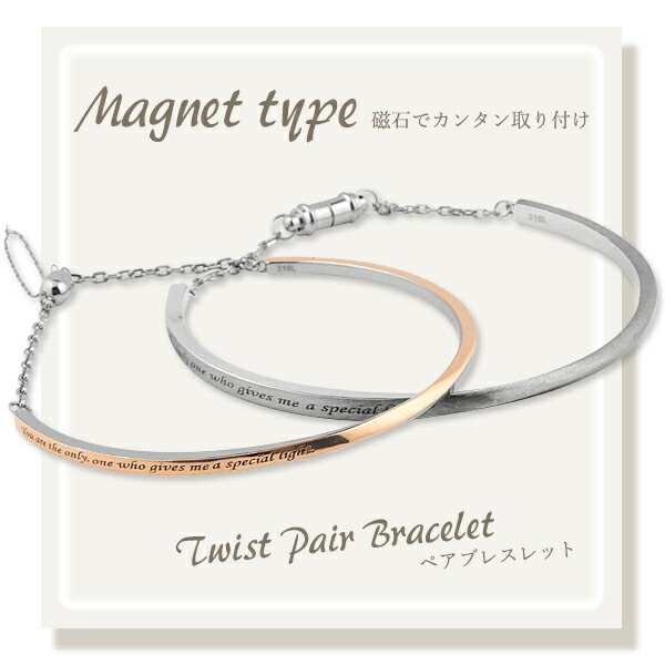ペアブレスレット 2本セット ステンレス 刻印無料 マグネット 磁石 ステンレス サージカルステンレス 金属アレルギー対応 ツイスト ひねり マットシルバー ローズゴールド ペア ブレス プレート レーザー刻印 名入れ 結婚 パートナー アジャスター付きで安心