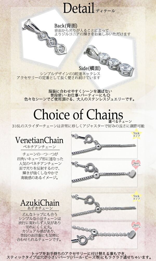 | コメント | スライダー式のステンレスチェーンはご自身でサイズ調整ができとても便利です。 あずきチェーンとベネチアンから選択可能 チェーンのエンドパーツはスティックとハートの選択ができます。 サージカルステンレス使用のアクセサリー。 医療用に使われているサージカルステンレスは肌に優しく、金属アレルギーでアクセサリーをつけられない方にも安心です。 シルバーアクセサリーより軽くて丈夫で変色しにくい素材ですのでお手入れ不要で海水や温泉につけても大丈夫です。 |