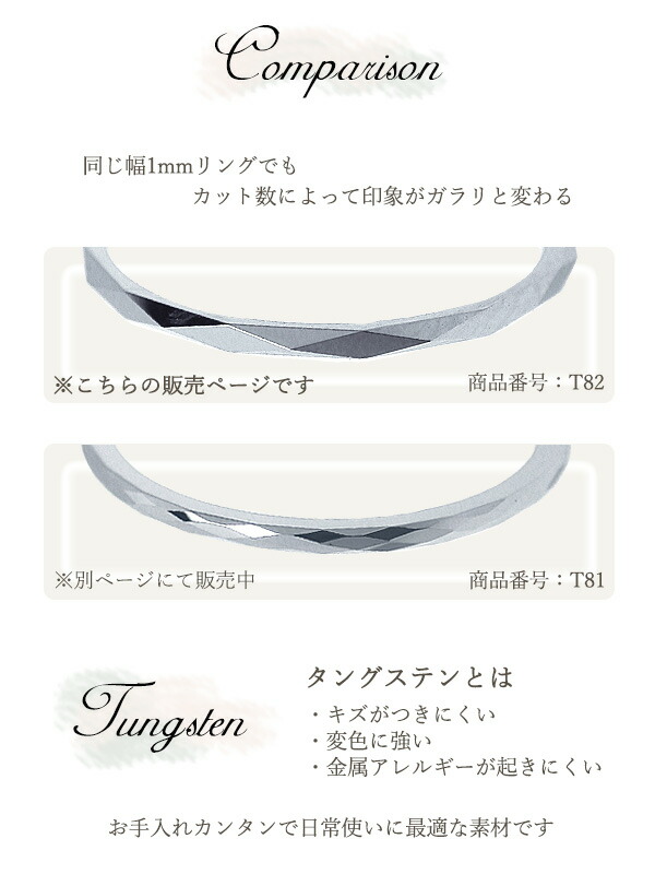 | コメント | 3つのカラーからお好きな色を選んでペアにできます!! 幅1mmの極細リング。タングステン使用のアクセサリー。 タングステンとはレアメタルの一つでダイヤモンドに匹敵する硬度をもち独特の黒い輝きがあります。 キズがつきにくく肌に優しく金属アレルギーでアクセサリーをつけられない方にも安心です。 シルバーアクセサリーより軽くて丈夫で変色しにくい素材です。お手入れも、柔らかい布などでサッと拭くだけいいので、とっても簡単です。 同じカラー・サイズ同士でもペアとしてご注文できます。 | ||