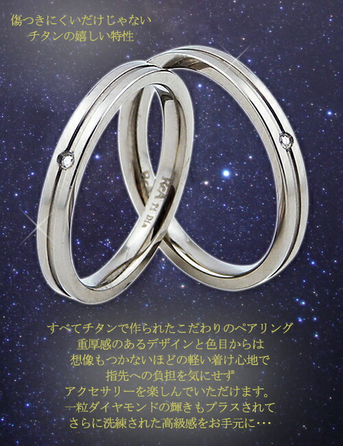 | 特徴 | チタン製アクセサリーの特徴 1、肌に優しい チタンは肌に優しくアレルギーの出にくい素材ですので、日常ずっと着け続けるアクセサリーとして最適の素材です。 2、強さ丈夫さ チタンはステンレスの3倍の強度とプラチナより高い硬度を持つ金属です。 3、軽い着け心地 チタンはステンレスの約1/2、金プラチナの約1/4の軽さです。 思わず着けてることを忘れてしまうくらい超軽量のため長時間着けるペア商品に最適といえます。 |