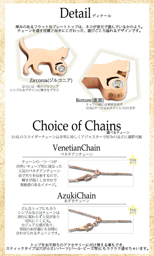| 商品名 | ネックレス レディースネックレス ステンレス サージカルステンレス ホワイトジルコニア 猫 ローズゴールド ギフト 誕生日 記念日 プレゼント スライダー式チェーン付き あずきチェーン ベネチアンチェーン 人気のネックレス ランキング かわいいモチーフで彼女 妻 女性 ママも喜ぶ クリスマス バレンタイン ホワイトデー 母の日 父の日 |