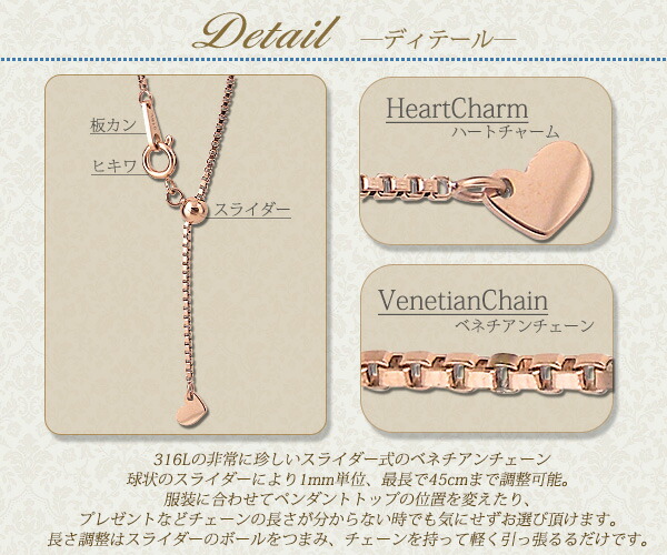 ステンレス ネックレスチェーン ネックレス チェーン スライド ベネチアンチェーン ベネチアン スライダー サージカルステンレス ベネ ハート ローズゴールド ピンク 45cm アクセサリー レディース メンズ 金属アレルギー対応 アジャスターチェーン