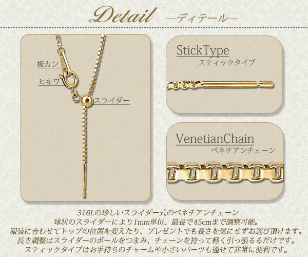 | 商品名 | スライダー式ベネチアンチェーン イエローゴールド スティックチャーム ステンレスチェーン サージカルステンレス アクセサリー |