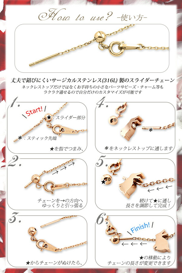 | コメント | スライダー式のステンレスチェーンはご自身でサイズ調整ができとても便利です。 今まで金属アレルギーでアクセサリーが着けれなかった方にオススメ!! 医療用に使われているサージカルステンレスは肌に優しく、金属アレルギーでアクセサリーをつけられない方にも安心です。シルバーアクセサリーより軽くて丈夫で変色しにくい素材ですのでお手入れ不要で海水や温泉につけても大丈夫です。 |