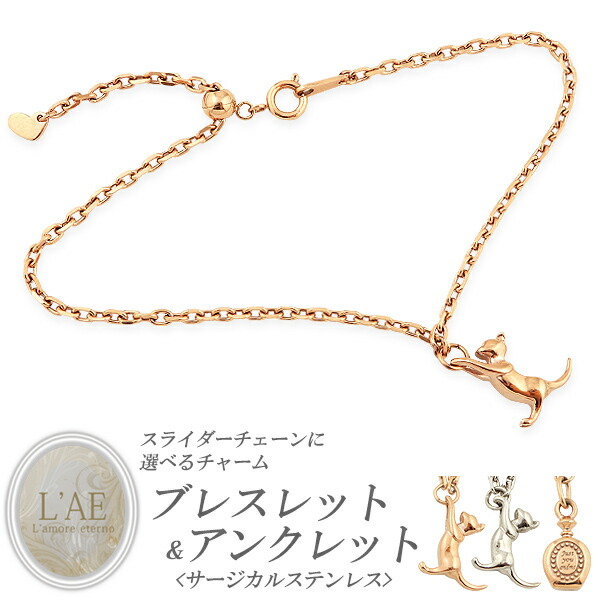 ブレスレット アンクレット レディース 金属アレルギー 対応 ステンレス サイズ調節ができる スライダーチェーン 選べるチャーム ネコ ねこ 猫 cat サージカルステンレス 誕生日 プレゼント