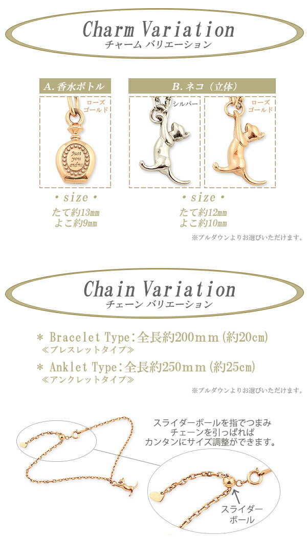 | サイズ | ・モチーフ別サイズ・ A.香水ボトル【縦幅13mm横幅9mm】 B.ネコ【縦幅12mm横幅10mm】 ・チェーン別サイズ(全体の長さ)・ ブレスレット:約200mm アンクレット:約250mm |