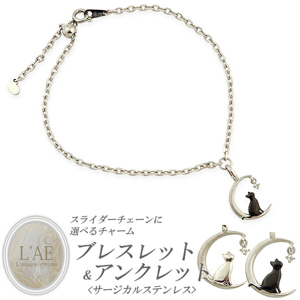ブレスレット アンクレット レディース 金属アレルギー 対応 ステンレス ジルコニア サイズ調節ができる スライダーチェーン 選べるチャーム 黒猫 ネコ ねこ cat 猫 月 ムーン サージカルステンレス 誕生日 母の日 シルバー ブレス 送料無料