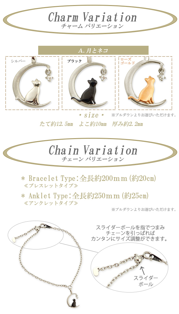 | サイズ | ・モチーフ別サイズ・ A.月とネコ【縦幅12.5mm横幅10mm】 ・チェーン別サイズ(全体の長さ)・ ブレスレット:約200mm アンクレット:約250mm |