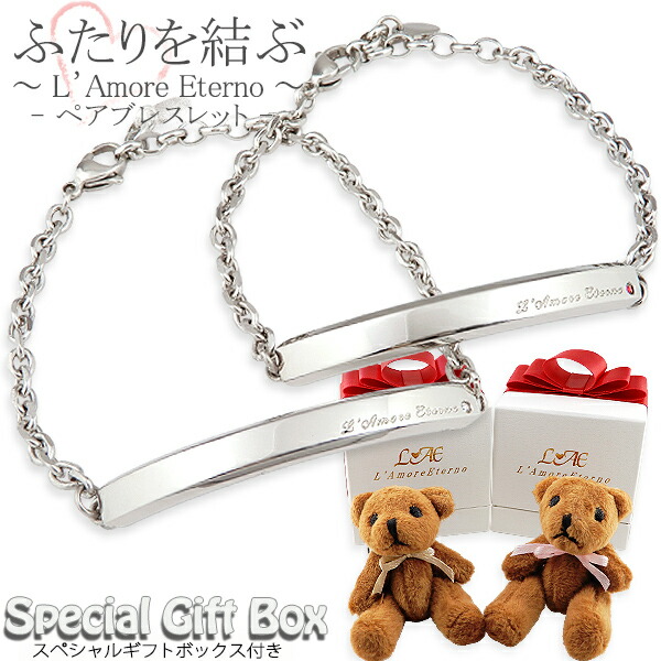ペアブレスレット レーザー刻印無料 ステンレス サージカルステンレス IDプレート 金属アレルギー対応 ふたりを結ぶ糸 縁結び 恋愛 ルビーカラー ジルコニア 名入れ メンズ レディース 記念日 ベアー付き