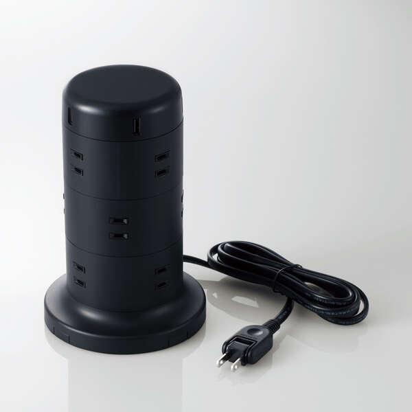 即納 エレコム タワー型タップ/12個口/雷サージ付/ホコリ防止シャッター付/固定可能/5ポート合計出力4.8A/2.0m/ブラック