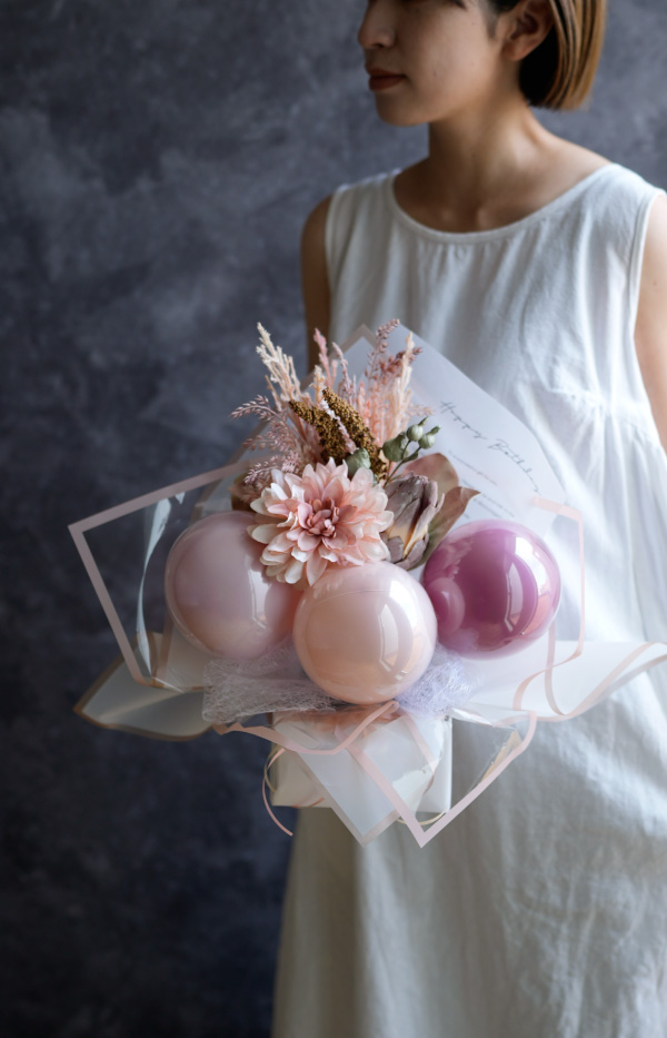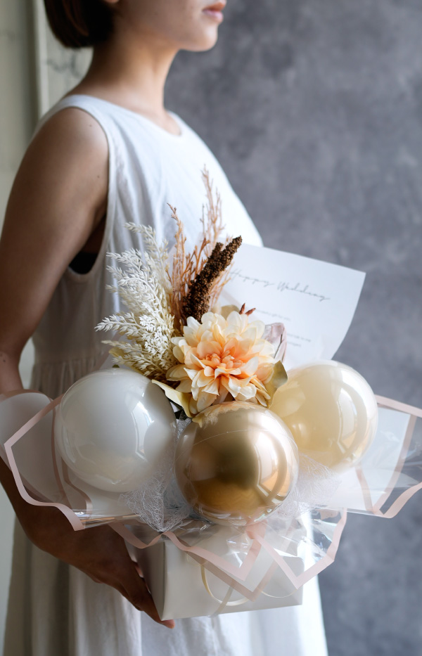 豪華で美しいアートフラワーとトレンドカラーのバルーンが絶妙に組み合わさった、洗練されたバルーンアレンジメントです。