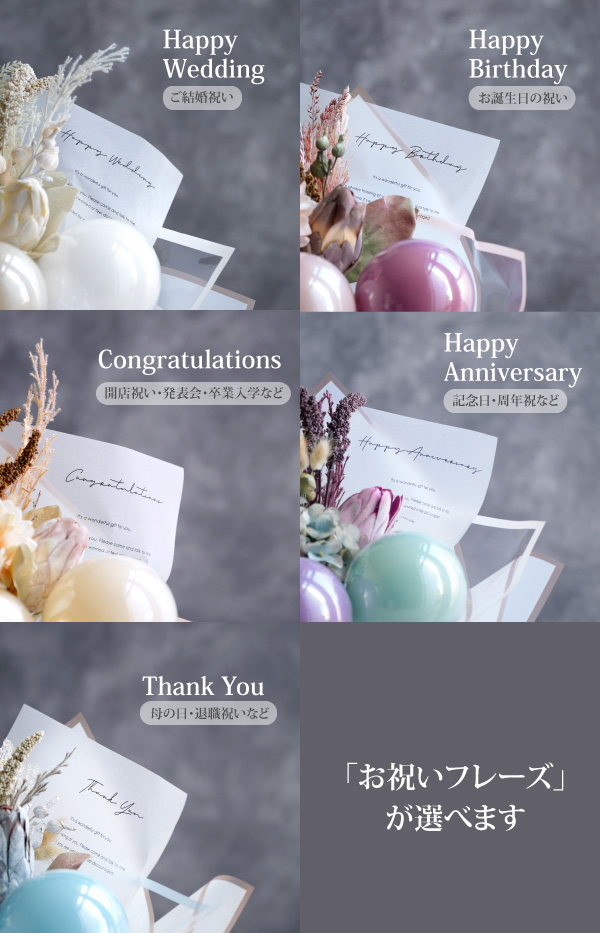 | 用途 | ・結婚祝い・お祝い電報・結婚記念日・結婚式受付用・二次会・お誕生日祝い・お誕生日プレゼント・開店祝い・周年祝い・発表会・卒業祝い・入学祝い・記念日・母の日・退職祝い・お誕生日パーティ装飾・1歳のお誕生日・ファーストバースディ・プレゼント・出産祝い・お礼・移転祝い・お祝い |