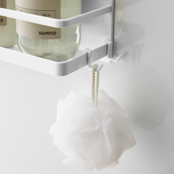 好きな場所に付けられるフックが2個付属しています。スポンジなどのバスグッズの収納におすすめです。