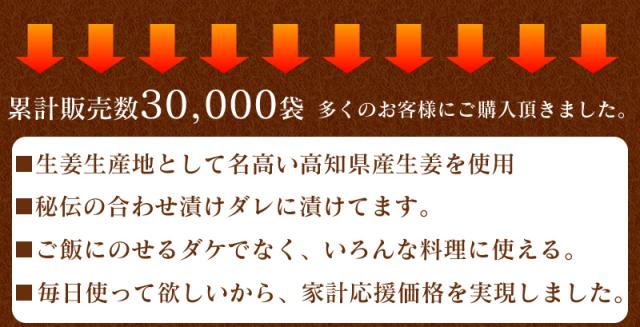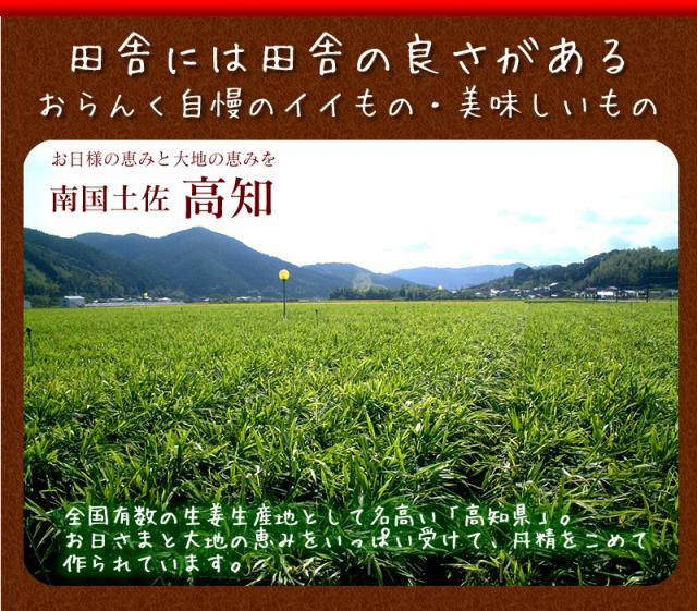 | 原材料名 | しょうが(高知県産)、漬け(醤油、砂糖、食塩、米黒酢)、調味料(アミノ酸等)、酸味料、乳酸Ca、酸化防止剤(ビタミンC)、※原材料の一部に小麦、大豆を含む |