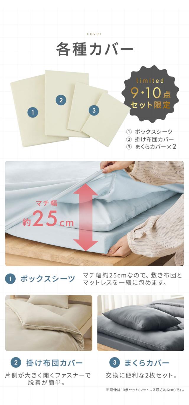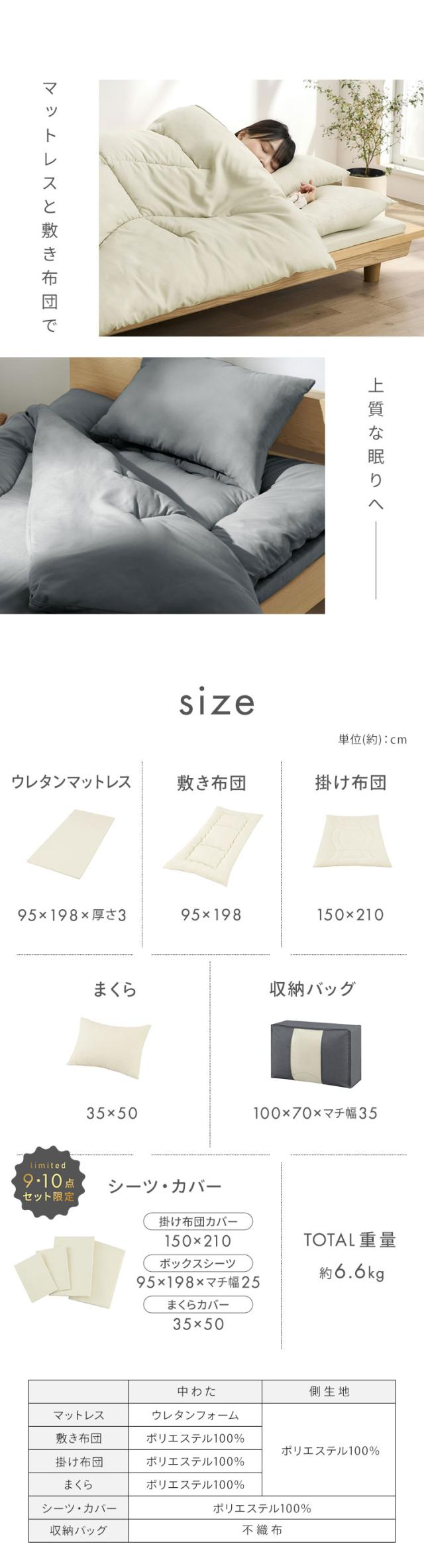 掛け布団、敷き布団、枕、掛け布団カバー、ボックスシーツ、枕カバー2枚、マットレス、収納バッグ