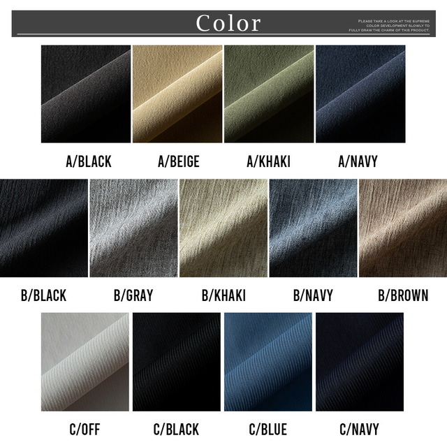 | 【A】ブラック ベージュ カーキ ネイビー 【B】ブラック グレー カーキ ネイビー ブラウン 【C】オフ ブラック ブルー ネイビー |