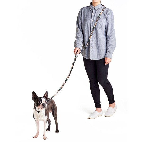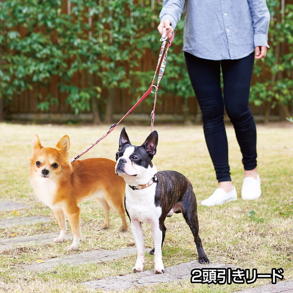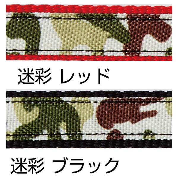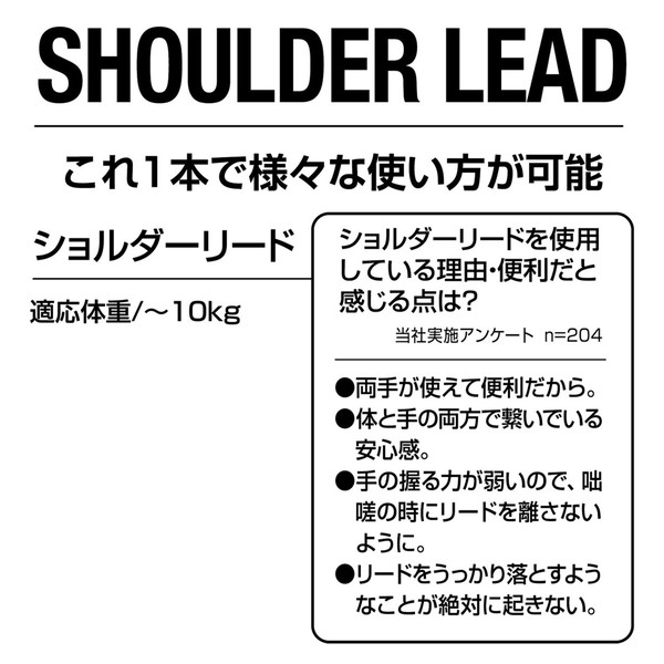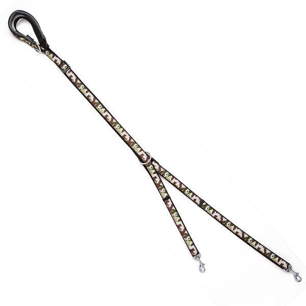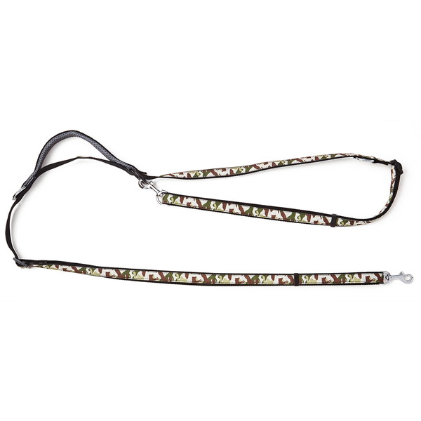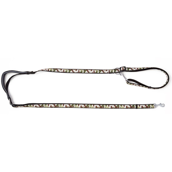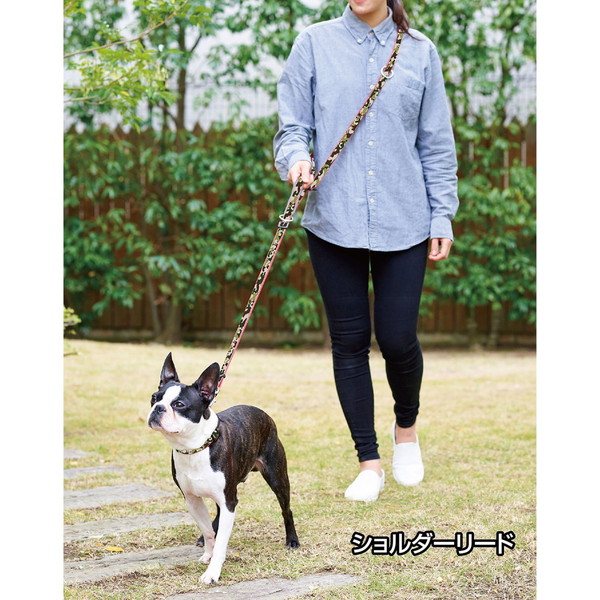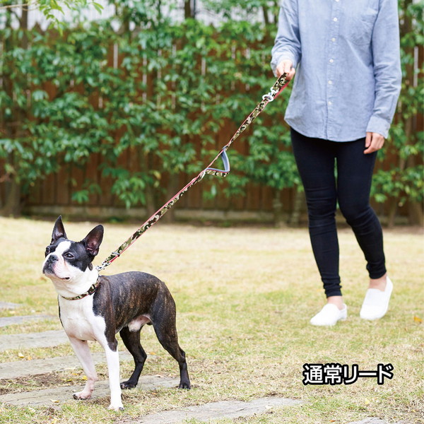 リサイクルポリエステルを使用し、抗菌加工を行った生地を使用。撥水加工で汚れが落ちやすい。これ一本で様々な使い方が可能で、「ショルダーリード」「通常リード」「2頭引きリード」「仮つなぎ」ができる。人気の迷彩柄。