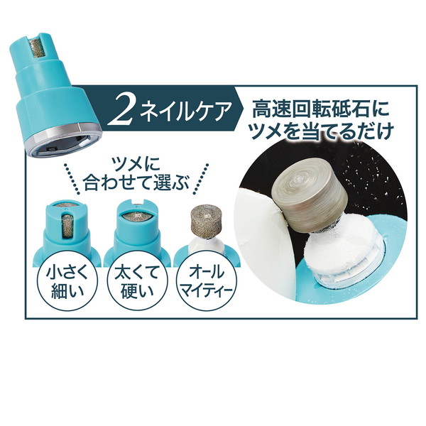 <ネイルケアヘッド(ツメを削る)【基本操作】1.ツメに合わせてガイドキャップを選択する。2.本体を持つ。3.電源を入れる。4.砥石の上面と側面にツメの先端部を当てて少しずつ削っていく。※砥石は高速回転するので皮フに当てないように注意する。※同じ箇所に砥石を長時間当てない。過剰にツメを削り痛めたり摩擦で熱を持つ恐れがある。5.使用後は電源を切る。≪カット・削る方法≫※作動音を嫌がる場合は、音だけを聞かせる等して少しづつ慣れさせる。