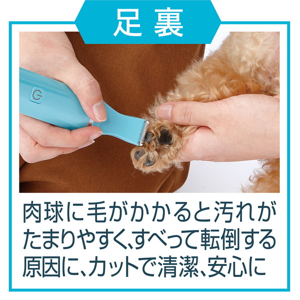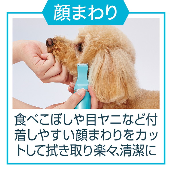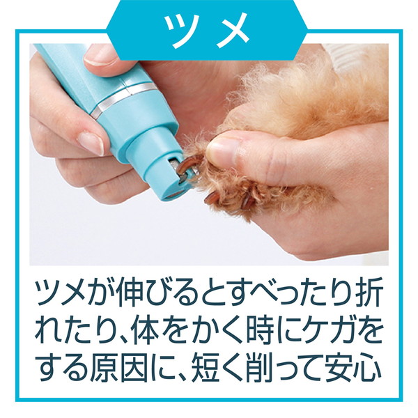 【削る合間にツメの削りカスを取り除く】研ぎ具合が悪くなった場合は掃除を行う。[足裏]※足首を握り、しっかり固定する。≪肉球≫肉球中心部を押し指の間を拡げ、肉球にかかる被毛を肉球に沿ってカット。※指の間の水かきに注意。※奥まで切りすぎないように注意。≪ツメ≫甲部分を軽く押してツメを出し、血管に注意しながら削る。※長時間の削りすぎに注意。[顔・口周り]マズルを固定し、皮フがたるんでる箇所は引っ張って平らにし少しずつカット。※垂れ耳の場合は、両耳に注意。※ヒゲに注意。[尻周り]しっぽを持ち上げ固定し、肛門周りにかかる被毛を中心から外に向かってカット。※肛門に注意。<バリカンの使用方法やカットの手順等、詳しい内容は「取扱説明書」に記載しています。>