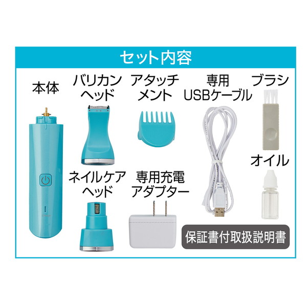 ■<セット内容>本体,バリカンヘッド,ネイルケアヘッド,アタッチメント,充電アダプター,USBケーブル(約1.5m),刃部用潤滑オイル(4mL),掃除用ブラシ,保証書付取扱説明書