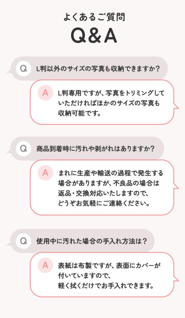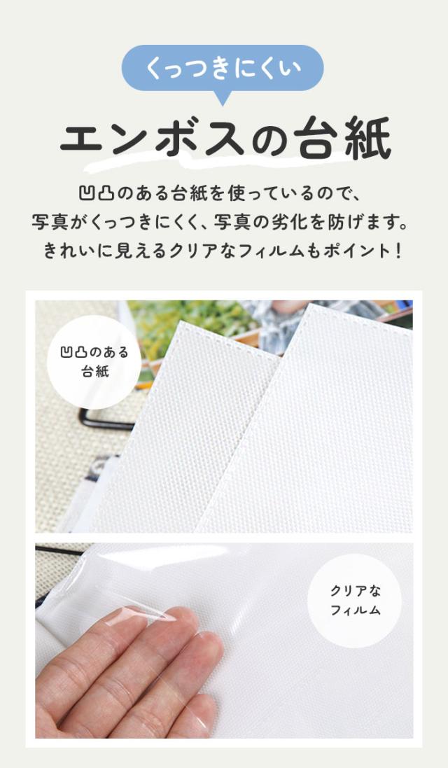 | 素材 | [表紙]布地(透明保護カバー付き) [収納ポケット]ポリプロピレン ※L判写真200枚収納収納可能。 |