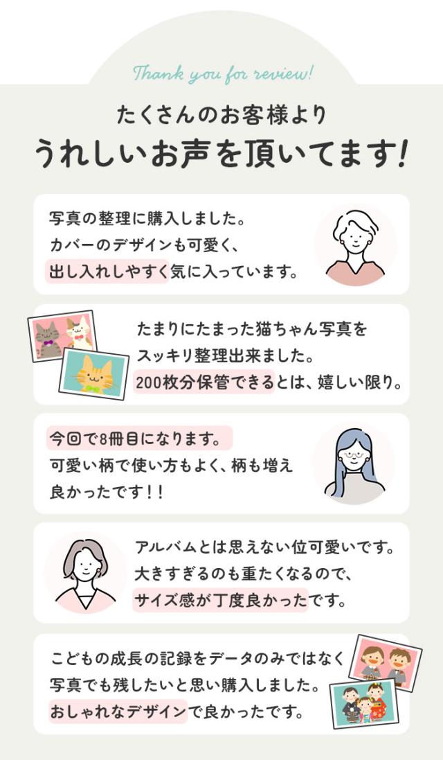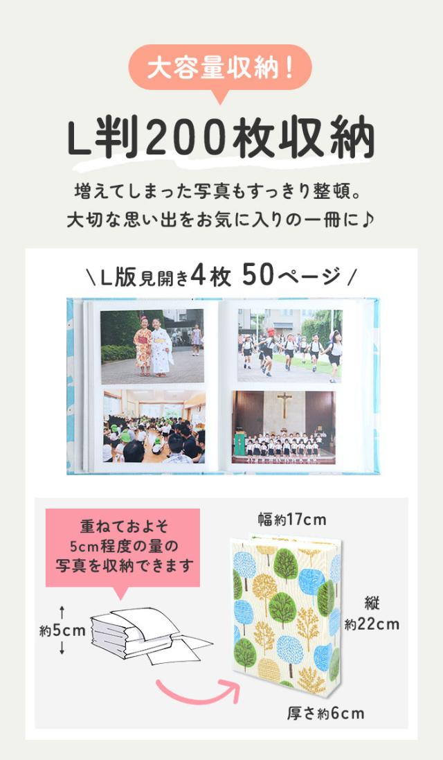 | 商品説明 | ・L判写真が200枚収納できる、大容量アルバムが新登場♪ ・見開きで、L判写真が4枚収納可能。全50ページ。 ・表紙には優しい印象のプリント生地を使用。さらに保護カバーも付いているので、気になる汚れからも守ってくれる。 ・大きくて重たいタイプのアルバムとは異なり、気軽に手に取って開きたくなる使い勝手の良い大きさとレイアウト。 ・増えてしまった写真もこれ一冊ですっきり整頓が可能。大切な思い出をお気に入りのアルバムにまとめて♪ |