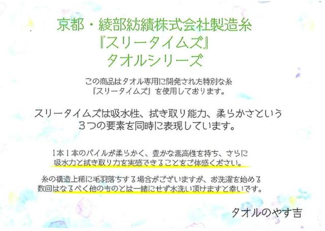 | やす吉の目安 | 厚さ ★★★★☆ ふわふわ ★★★★☆ 乾きやすさ ★★★☆☆ |