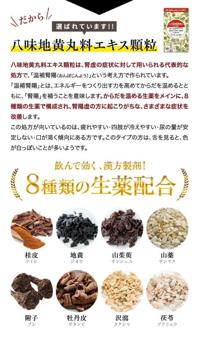 ジオウ 3.33g、サンシュユ 2.00g、サンヤク 2.00g、タクシャ 2.00g、ブクリョウ 2.00g、ボタンピ 2.00g、ケイヒ 0.67g、ブシ末 0.67gより抽出。
