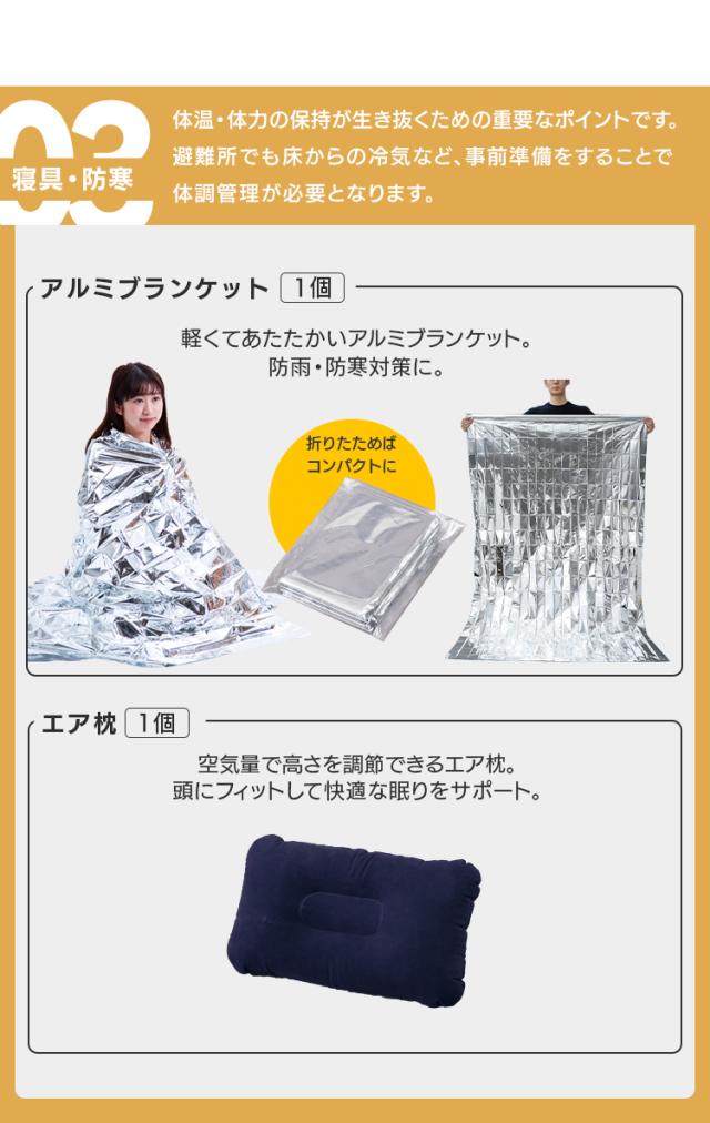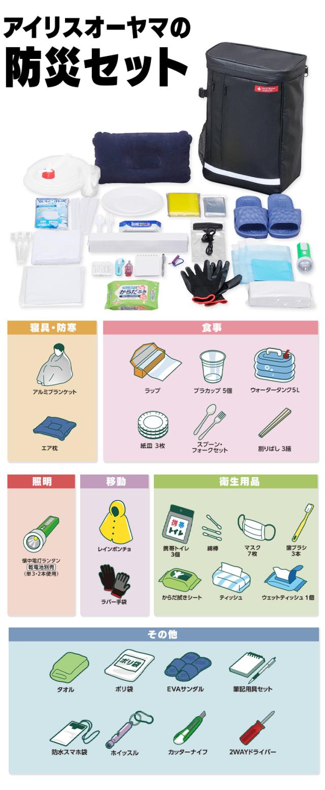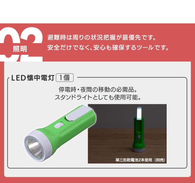 懐中電灯ランタン(単3形乾電池×2本別売り)、エア枕、アルミブランケット、綿棒×20本、マスク(ふつうサイズ)7枚入り、歯ブラシ×3本、携帯用トイレ×3個、からだふきシート50枚入り、ティッシュペーパー、ウェットティッシュ10枚入り、ラップ、プラカップ×5個、ウォータータンク5L、割りばし×3膳、スプーンフォークセット、紙皿×3枚、レインポンチョ、ラバー手袋、ボディタオル、ポリ袋、EVAサンダル(26cm)、ホイッスル、筆記用具セット、防水スマホ袋、カッターナイフ、2WAYドライバー