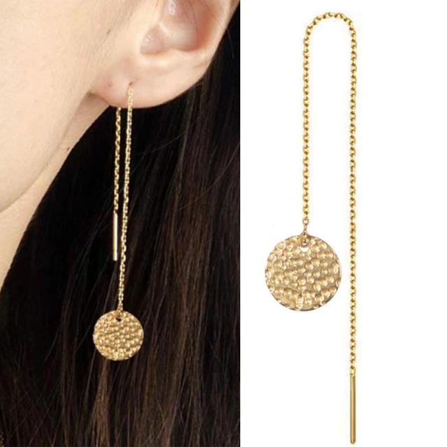 ゴールドのコインのような丸いチャームをステンレスチェーンのトップにセットしたアメリカンチェーンピアス。