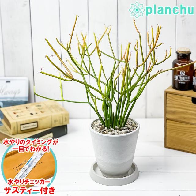 PLANCHU 観葉植物 ユーフォルビア ファイヤースティック 4号樹脂鉢 ホワイト サスティー付き 受け皿付き 育て方説明書付き 多肉植物