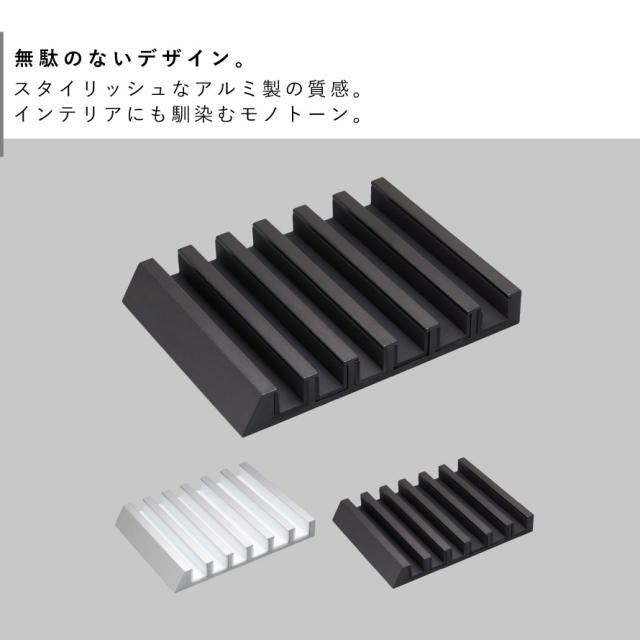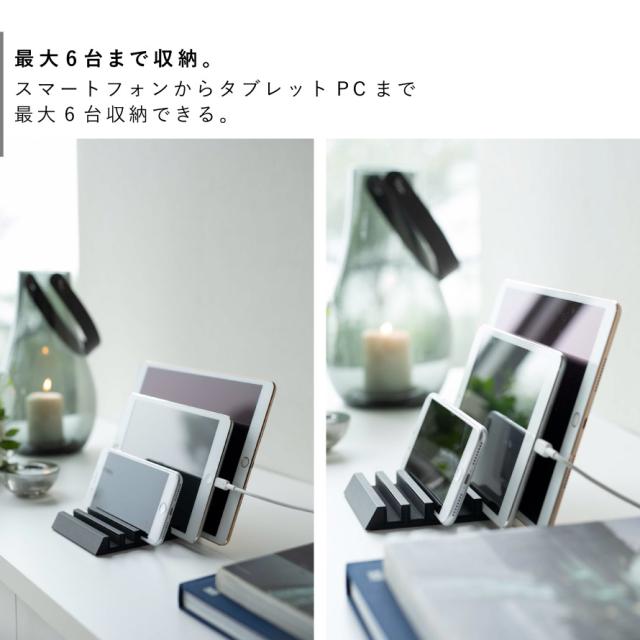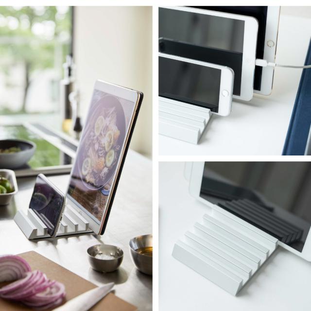 スマートフォンからタブレットPCまで最大6台を立てて収納できるタブレットスタンド。タブレットのレシピを見ながらの調理に便利。スタイリッシュなアルミ製の質感。丈夫で長くお使いいただけます。