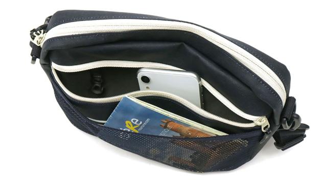 メインルームはA5サイズがすっきり収まる小ぶりなサイジングで、身軽にお出掛けしたい日に重宝します。内装にクッション性のあるベルクロポケットを1ヶ所備えており、スマートフォンなどのデリケートなアイテムを軽い衝撃から守ります。